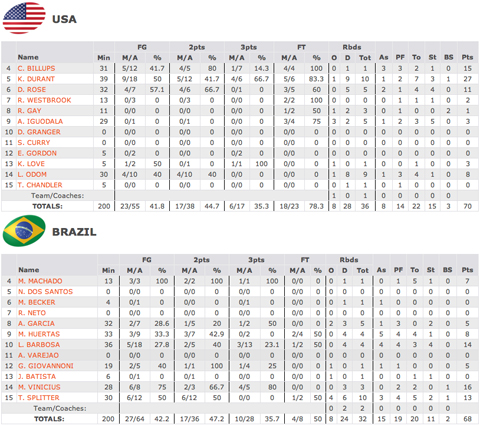 Le début du match dessinait les grandes lignes de la rencontre avec deux équipes au coude à coude. Marcelo Huertas, toujours précieux dans la gestion du jeu, commençait à jouer le pick-and-roll avec Splitter. Et les brésiliens ne refusaient pas le jeu rapide. Surtout, leur repli défensif était extrêmement efficace et empêchait toute contre-attaque américaine, pourtant leur plus grande force.