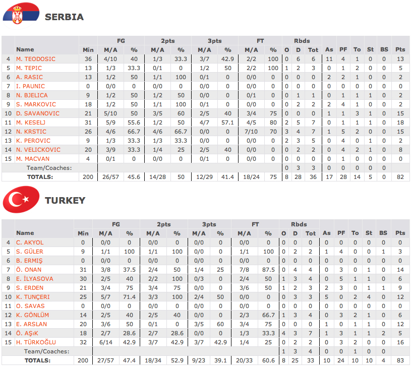 Marko Keselj prenait le rebond, récoltait la faute et marquait les deux lancers. La Serbie repassait devant. 80-79. Semih Erden, venu au relais d’un Ömer Asik qui fit semblant d’être blessé pour ne pas avoir à tirer de lancers, inscrivait le panier et ratait le lancer bonus.