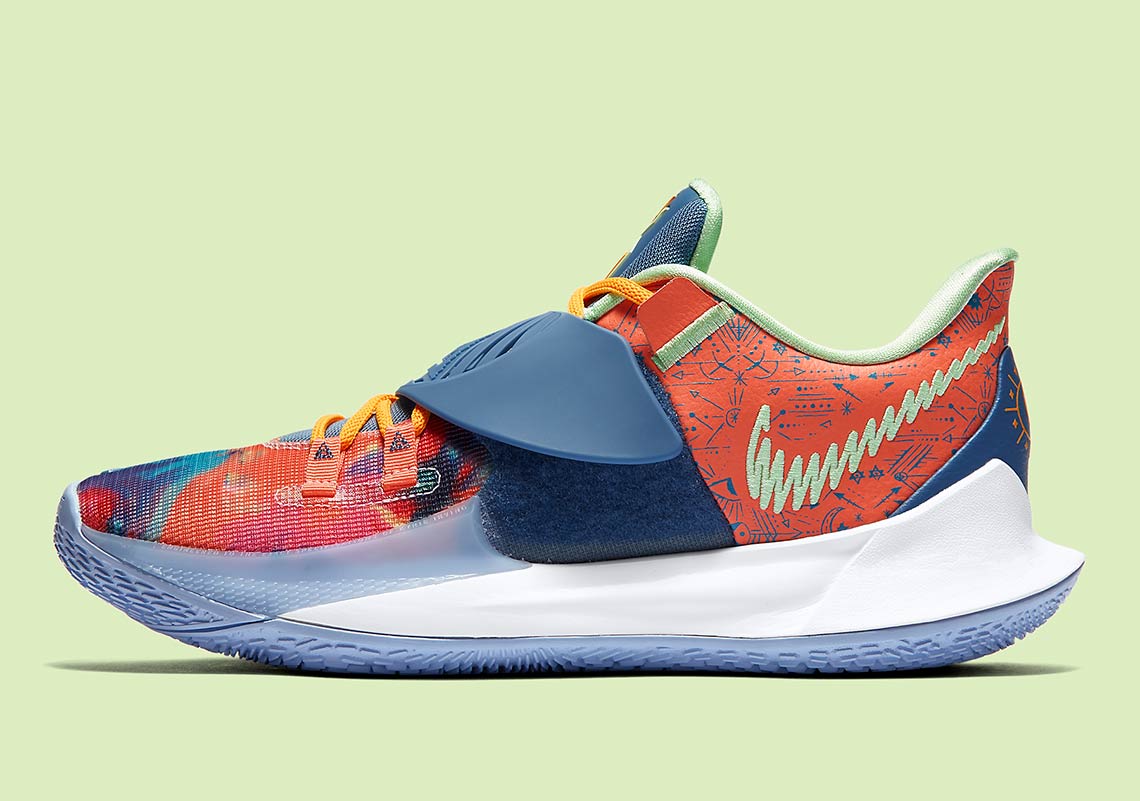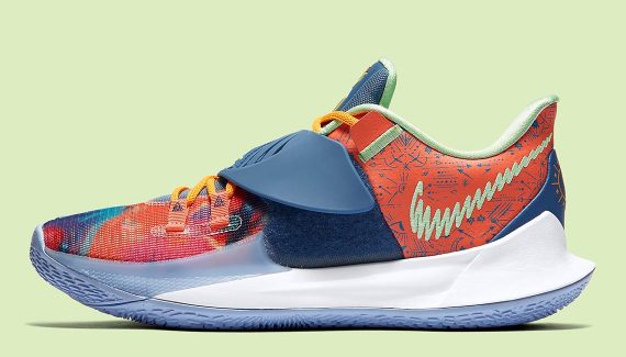 La Kyrie Low 3 dévoilée à la fin du mois de juin était arrivée toute de blanc vêtue, mais avec une semelle brillante dans le noir. Le second aperçu du modèle offre un design diamétralement opposé qui ressemble beaucoup plus au meneur de jeu des Nets.