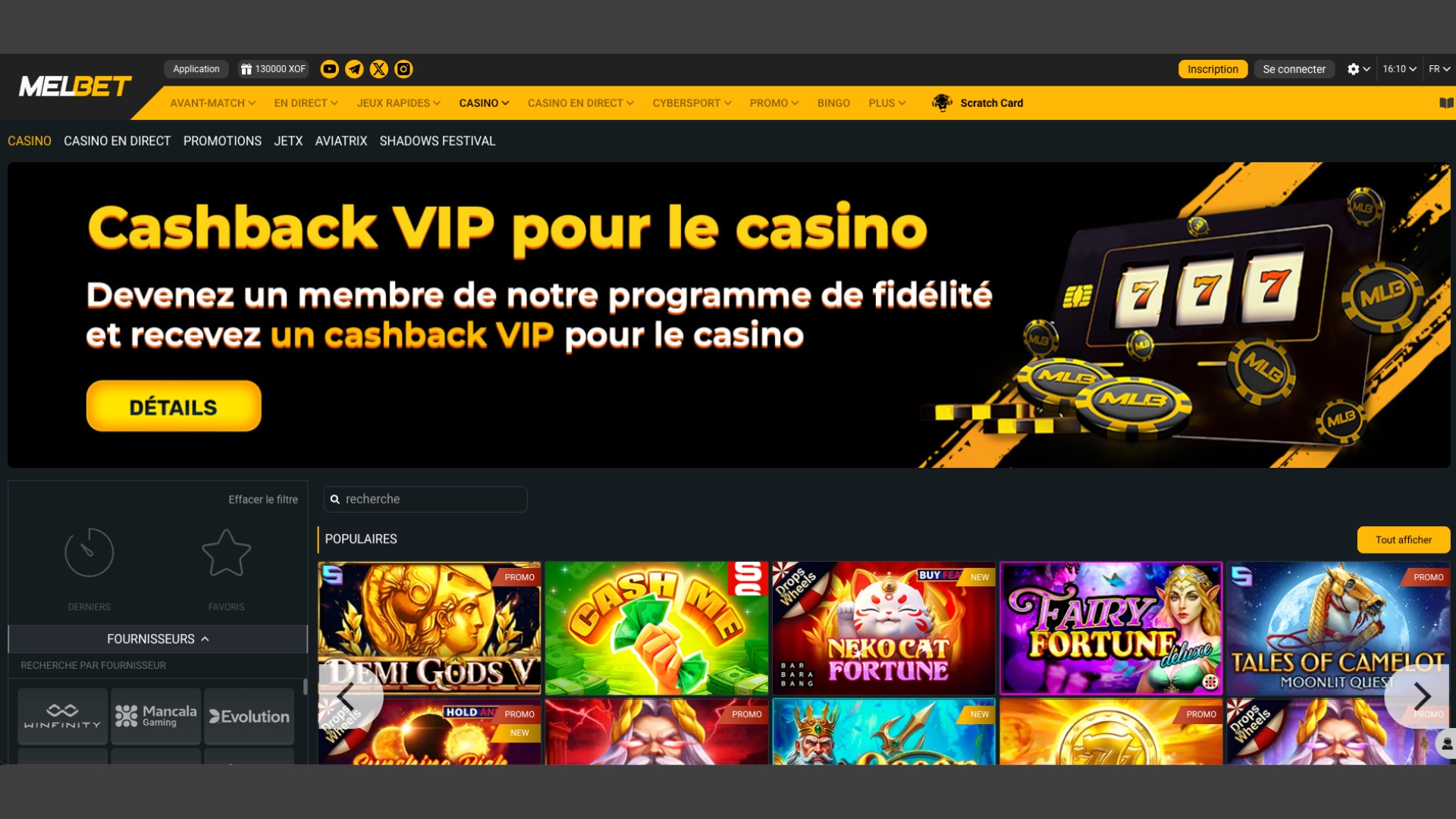 Le casino en ligne de Melbet complète l’offre paris sportifs avec une ludothèque conséquente. Les amateurs de jeux de table trouvent le blackjack, la roulette et le baccarat. Les machines à sous occupent une place centrale avec plusieurs centaines de titres des meilleurs éditeurs.