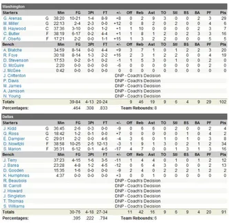 | D. Nowitzki | F | 38:58 | 10-25 | 2-5 | 12-13 | -3 | 1 | 9 | 1 | 3 | 0 | 2 | 1 | 2 | 34 |