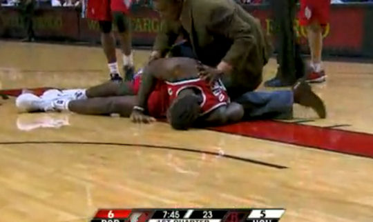 Au départ, un Oden qui tente de défendre sur Aaron Brooks. Les deux joueurs se touchent à peine, mais Oden retombe lourdement.