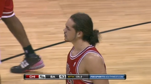 Il reste moins de deux minutes à jouer et le score est de 91-91. Après un tir manqué de Derrick Rose, Tony Parker, qui vient de planter deux paniers pour porter son total à 20 pts, récupère le rebond face à Noah et remonte la balle avant de temporiser et servir Tim Duncan sur le côté. L’intérieur des Spurs se défait du marquage de Noah et s’en va en lay-up au panier mais Jooks arrive en deuxième rideau et le bâche (en lui accrochant la main il faut bien le dire). Après bien des palabres, le contre est jugé licite et la balle rendue aux Spurs ligne de fond.