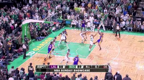C’est Ray Allen qui défend sur Kobe pour cette dernière possession Lakers. Difficile de faire mieux : Kobe ne peut pas driver, ne peut pas passer. A 3-pts ? Pas possible non plus. Un échange avec Ron Artest, un dernier coup de collier et Kobe s’avance jusqu’à la ligne des lancers-francs. Il stoppe son dribble, s’élève, recule juste ce qu’il faut pour échapper aux bras de son chien de garde et déclenche son tir : ficelle ! Ce n’est toujours pas sur ce coup-là que les Celtics battront les Lakers.