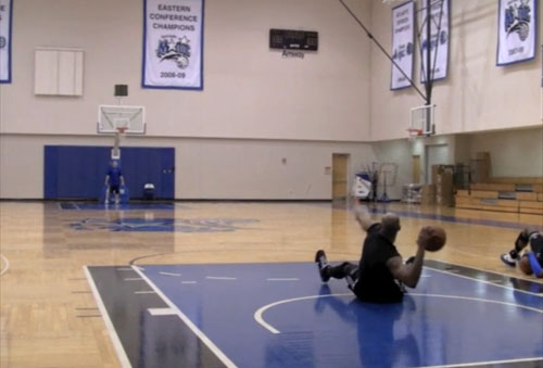 Il y a 10 jours, Dwight Howard battait un record du monde en rentrant un shoot de 16 mètres tout en étant assis. Aujourd’hui, à la fin de l’entrainement, il a tenté de battre son propre record. Cette fois, il s’était installé sur la ligne des lancers francs opposée, soit à une distance de plus de 26 mètres. Alors qu’Howard éprouvait quelques difficultés, Vince Carter est arrivé et, dix minutes plus tard, a rentré le shoot. Incroyable !