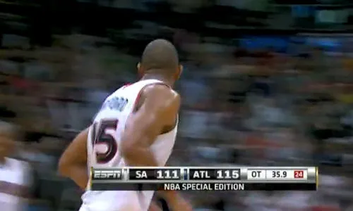 Durant la prolongation, les Spurs ne le lâchent pas d’une semelle, connaissant son pouvoir d’exécution. Qu’importe, puisqu’il est pris le plus souvent à deux, cela signifie qu’un coéquipier est démarqué. Deux fois, l’offrande sera pour Al Horford, Johnson se gardant tout de même un joli jump shoot en reverse, George Hill étant trop court. 115-111 à 35 secondes du terme, cette fois ce sera la bonne, malgré un nouveau match de mammouth de Tim Duncan (29 pts / 13 rbds) aux côtés de Ginobili. Joe Johnson termine tout de même avec 13 assists tandis que Horford, qui achève le travaille aux lancers-francs avec Marvin Williams, martyrise la raquette avec 18 rebonds dont 9 offensifs. Il se paye même le luxe d’un monumental poster dunk sur Tim Duncan en troisième quart-temps, digne de la première place d’un Top 10.