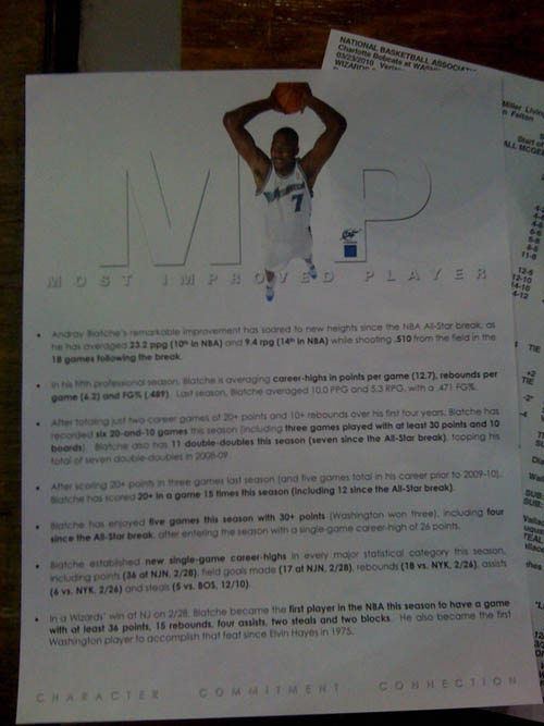 - Décidément, rien ne va pour les Wizards cette saison. L’équipe avait ainsi distribué des brochures pour expliquer aux journalistes pourquoi Andray Blatche méritait le titre de MIP. Quand ? Le soir où il a refusé d’écouter les consignes de son coach avant d’être cloué sur le banc.
