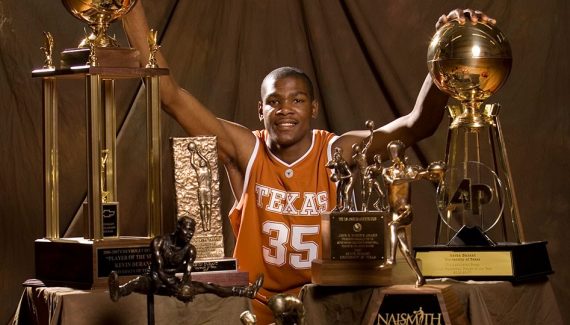 Certes, son équipe sera éliminée dès le second tour du tournoi final, mais cela n’a pas empêché Kevin Durant de remporter tous les trophées individuels de la saison et de s’imposer comme le meilleur universitaire du pays. Tout « KD » et sa panoplie étaient déjà visibles alors qu’il n’avait que 18 ans : sa taille, son shoot, son superbe geste.